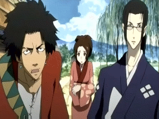 Samurai Champloo.... what the hell does that name mean? I still don't know, but since it's by the guy who did Cowboy Bebop it's certainly going to be worth a look. Of course resisting comparing the two, when they do have such a similar flavor and style, could be hard. SynopsisThe setting is feudal Japan.... sort of, there's enough anachronistic references to let you know not to take it too seriously. And in this land we meet two men, polar opposites in character, and alike in only one aspect. And that is that both of them are ice-cold killers, people who have faced and delivered death so many times that they have lost touch with `normal'. Always ready to live or die in a split second, the only thing they can trust are their own skills and strength. Thus, when they meet, it is inevitable that they will fight to see who is the stronger and who has finally met his match. ... At least that's what should happen. But in this case a young girl, who in some ways instigated the meeting, decides they should both be her companions. And through some fast (and loud) talking, a challenge, a bet, a rescue, and some other interruptions that prevent them fighting that's what ends up happening. Both of them not so much guarding her as wandering in the same direction as she seeks the "Samurai who smells of sunflowers". And along the way, as is the case with all such road movies, a variety of interesting things happen. SynopsisLet's get one thing out of the way, it's really rather good. I'll get onto the "but" later, but this is really watchable anime. The stories are very well crafted, the combats are dramatic and well animated and the characters are fantastic. The main characters being the absolutely ice-cold Jin, a person always observing and thinking but who keeps his thoughts and emotions to himself. He's polite. elegant even, but his swordsmanship is superbly deadly. On the other side is Mugen, someone who never learnt control, manners or restraint. He's full of a wild energy, a hatred of authority and limits, and always ready, even eager, for violence to erupt. His style is as wild as he is, acrobatic and dramatic, but effective and confusing to those he faces. And in the middle is Fuu. It is her odd quest that is, in theory, the core of the story. However in practice her job is to be the emotive one, to end up getting into trouble, and primarily to keep the two mains from killing one another. It's exactly like a inverse harem comedy, her primary role is to explain why Mugen and Jin would actually stay in each others company. The main problem is that while she's quite likable she's nowhere near as cool, or as talented, as the guys. Thus she actually ends up filling a relatively minor role in many of the stories. We do get to meet some females who can earn respect from the guys, which means they end up outshining her too. In this quite combat based show she's generally the spectator. Which is as good a intro as any to the "but" part of the review. I'm not sure if this is me being helpful, or just being obsessively picky, but I guess that's the problem a reviewer always faces. The summary is that this is great anime... but it's not as good as cowboy Bebop. There are basically two reasons why and they somewhat overlap. The primary is that these guys are basically bums following fuu's quest because they have nothing better to do. As a result there's little teamwork and even less direction. They basically wander through the landscape and the story has to come to them, and give them some pressing need to be involved. It means that they are extremely passive relative to the story, and some rather unlikely events (generally involving fuu-chan) have to occur to drag them into some stories. And when the stories are over the events fade into the background and are forgotten, unless they are needed to generate some more enemies for future episodes. We only really discover the reason for Fuu's quest, and Jin's wandering, in the second last episode. The conclusion, at the end of a three part mini-arc, is intense but ultimately rather meaningless. The other is that this show is denied much variety in environment. Having set the foundation in "samurai costume drama", and the limits of movement to "walking pace", the environment tends to blur after a while. It makes it seem unlikely they could really get into that many weird situations in such limited time. Even more it seems the creators got bored themselves and started to come up with wilder stories, and some over-acting characters, to make it more dramatic. This can lead to some very silly episodes of which the US-Japan feudal baseball match is unarguably the worst. Even the fights become more and more fantastic as time goes by. In simple terms this very loose association of skilled but private people worked better in bebop. There they had a loose common purpose (getting a bounty) which meant they had to work together sometimes, towards a goal, in a novel and intrinsically interesting environment. This series just doesn't seem to gel as strongly, and the rather weak conclusion is fairly symptomatic of that. The "rap" element, such as "scratching" the anime, doesn't really seem to pan out either... in fact that particular visual trick doesn't make it past the first episode from memory. Of course, "not quite as good as Bebop", even if true, isn't really much of a criticism. And that's probably a better way to see it. This is a very skilled anime that is extremely pleasant to watch, rather addictive actually. The characters of Jin and Mugen partly overshadow Fuu simply because they are so strong, and the action and humor are great. If you liked Bebop, which covers a rather large number of people, I'd gladly recommend giving this one a try. ProductionSpectacular production values, that's one thing the show can certainly be proud of. Strong character art and the ability to make it move well and show strong expression. The environments are well rendered and the action i